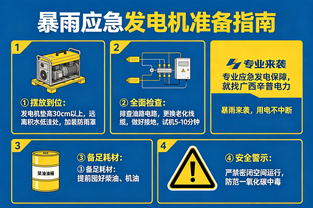 暴雨天气突袭,往往伴随突发停电,应急发电机作为电力保障核心设备,其提前准备工作直接决定了供电能否及时衔接,避免因停电造成生产中断、生活不便。为帮助大家规范做好暴雨前应急发电机准备工作,规避设备故障与安全隐患,广西辛普电力结合十多年实操经验,整合专业防护知识,为大家整理了一份全面、规范的应急准备指南。
